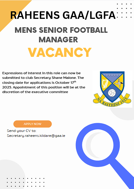 Raheens GAA/LGFA is inviting expressions of interest for the position of Men’s Senior Football Manager.