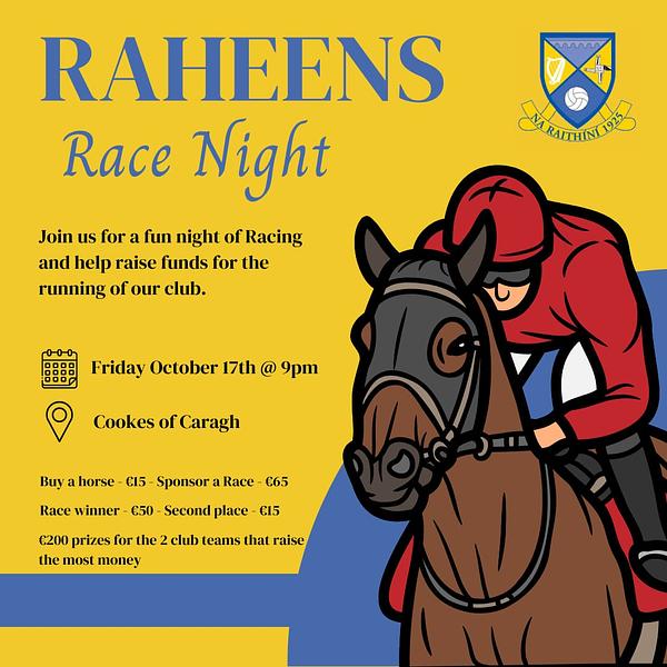 Raheens Race Night goes to post on Friday, Oct 17th @ 9pm in Cookes of Caragh! 🎉