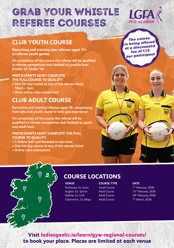 On Saturday the 7th of February, the LGFA are hosting a Youth Referee course in the Leinster Council GAA Offices, Portlaoise . The course will run from 10am until 5pm. These courses are being offered at a discounted rate of €15 per participant (repayable to participants by the club).