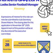 Raheens GAA/LGFA is inviting expressions of interest for the position of Ladies Senior Footbal...